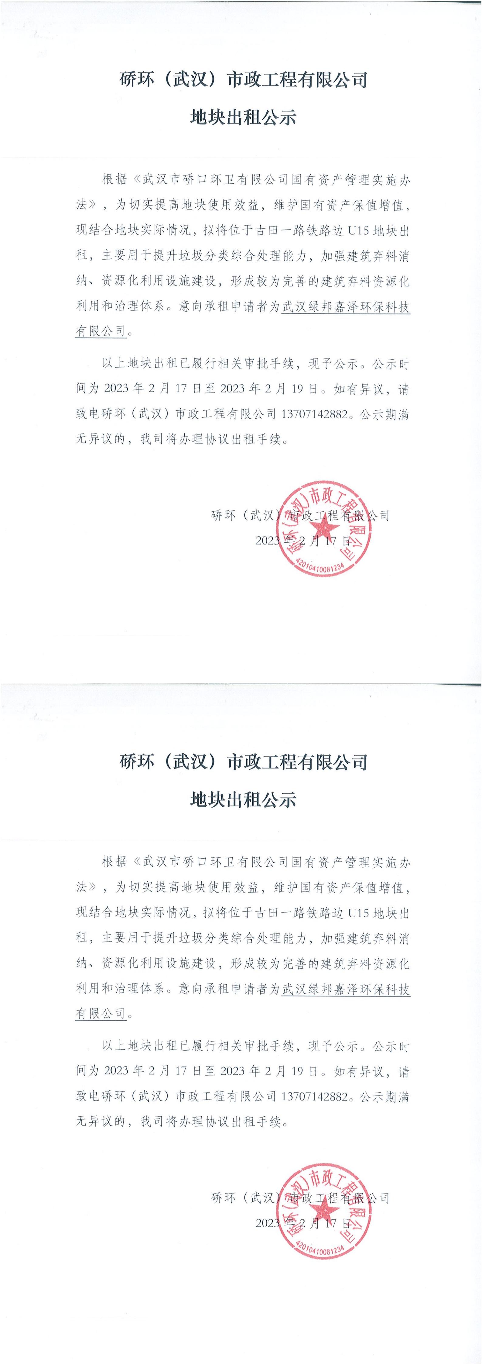 硚環(huán)(武漢)市政工程有限公司地塊出租公示
