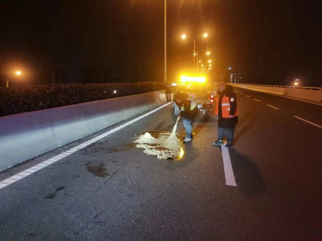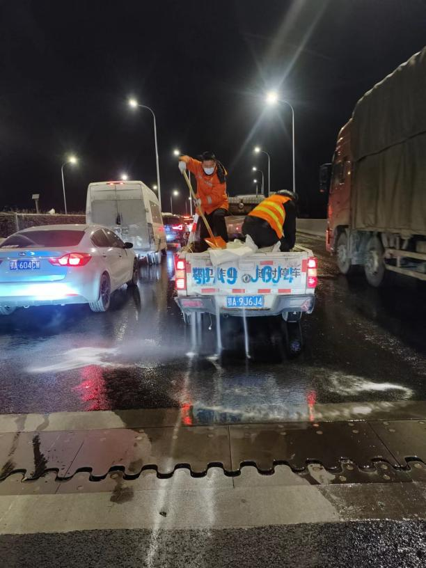 1月23日晚7點,接上級單位通知,發現三環線長豐橋往宜家方向水管破裂導致路面有大面積積水。因夜間氣溫較低路面容易結冰,可能造成交通事故。硚環公司迅速反應,備勤小組成員第一時間到達現場,迅速采用“人機”協作模式,迅速開展融雪防凍工作,拋灑融雪劑,清理路面積水,保障早上市民出行安全。