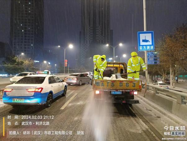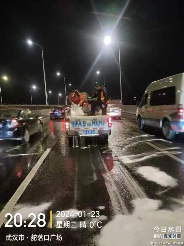 截止至24日早7點,硚環公司已出動應急人員125人次、出動車輛29臺次、對全區主次干道、環線、高架、易結冰部位不間斷巡查,預灑融雪劑12.9噸,鋪設草墊900條。