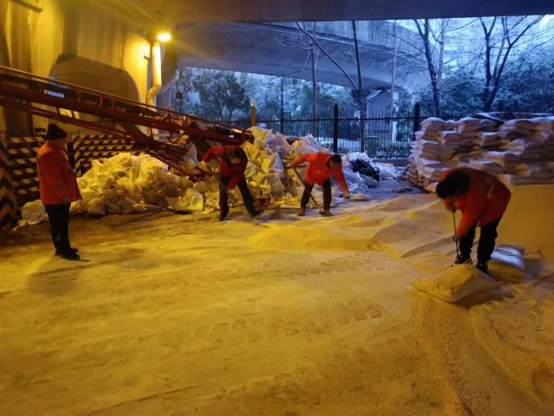 自2月2日啟動低溫雨雪冰凍災害應急響應至今,公司累計出動人員約5000人次,出動鏟車、雪鏟推車、大貨車等車輛設備約320車次, 布鹽約520噸,鋪設麻袋11000條,期間到鐵路貨場轉運工業鹽120噸。