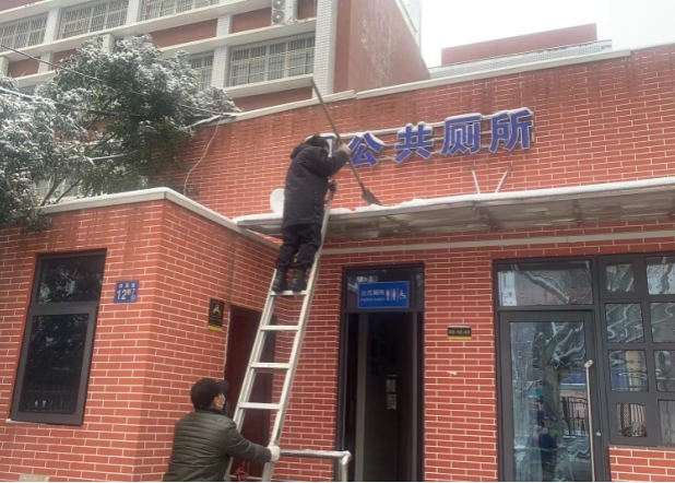因雨雪道路濕滑,為避免市民如廁時因地面瓷磚濕滑造成意外受傷,項目五部在全區公廁門前鋪設防滑墊、在醒目位置擺放防滑警示牌等,廁管員按照“隨進隨拖”原則,對地面進行及時清潔,保持地面干凈、干燥,并安排人員清理公廁進門處頂棚積雪,保障市民如廁安全。