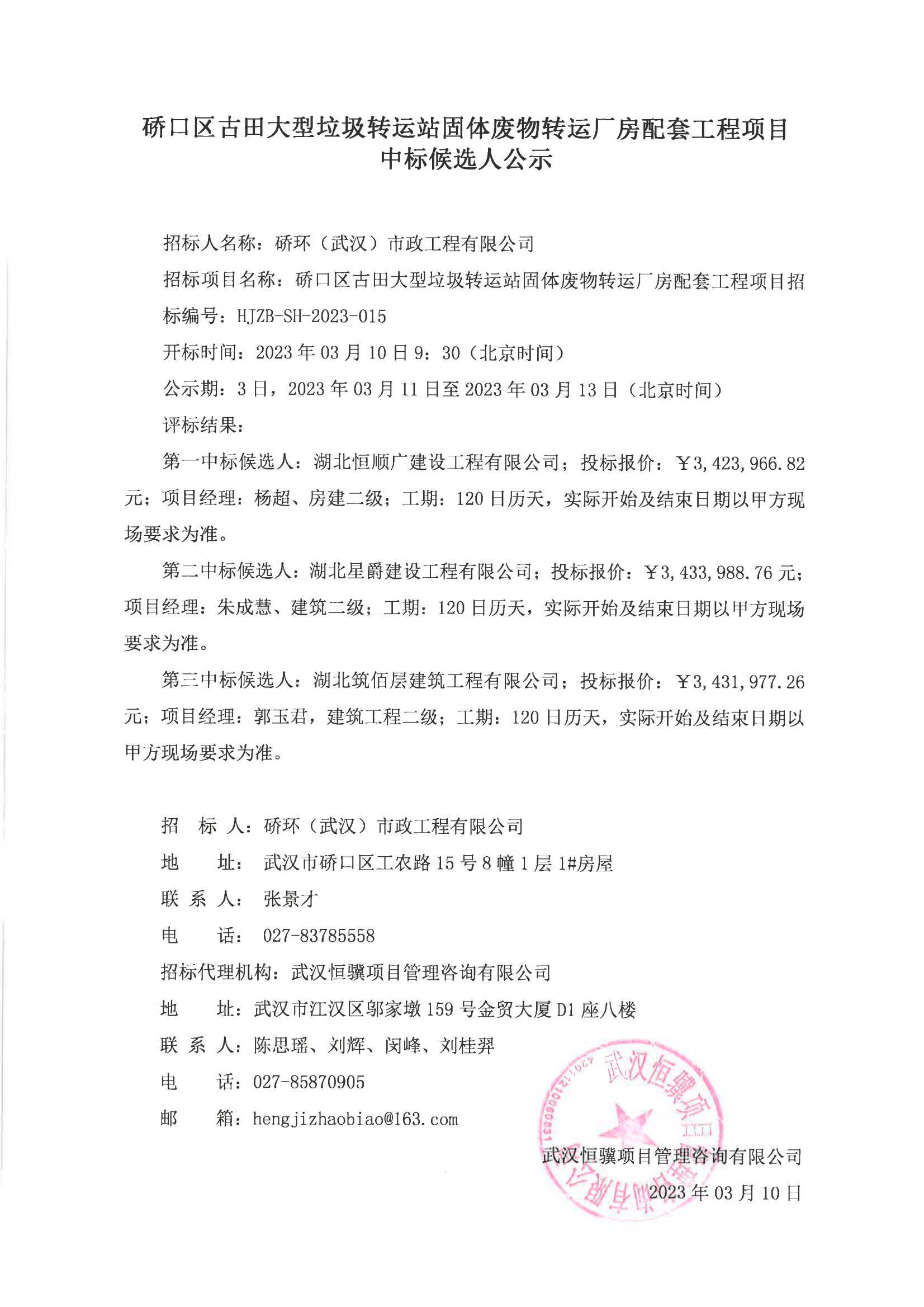 固廢物料轉運廠房配套工程項目中標候選人公示